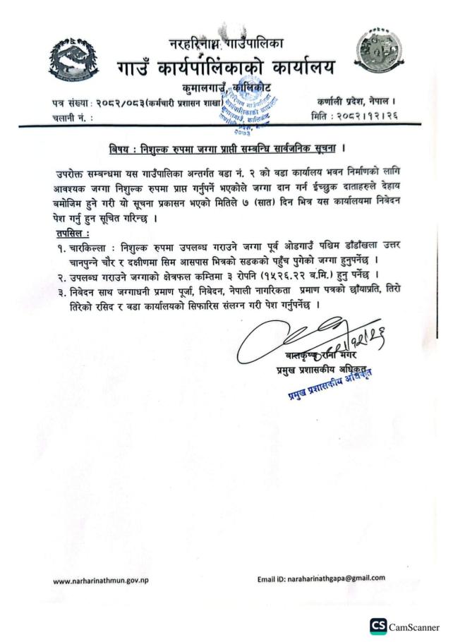 » निशुल्क रुपमा जग्गा प्राप्ती सम्बन्धि सार्वजनिक सूचना ।