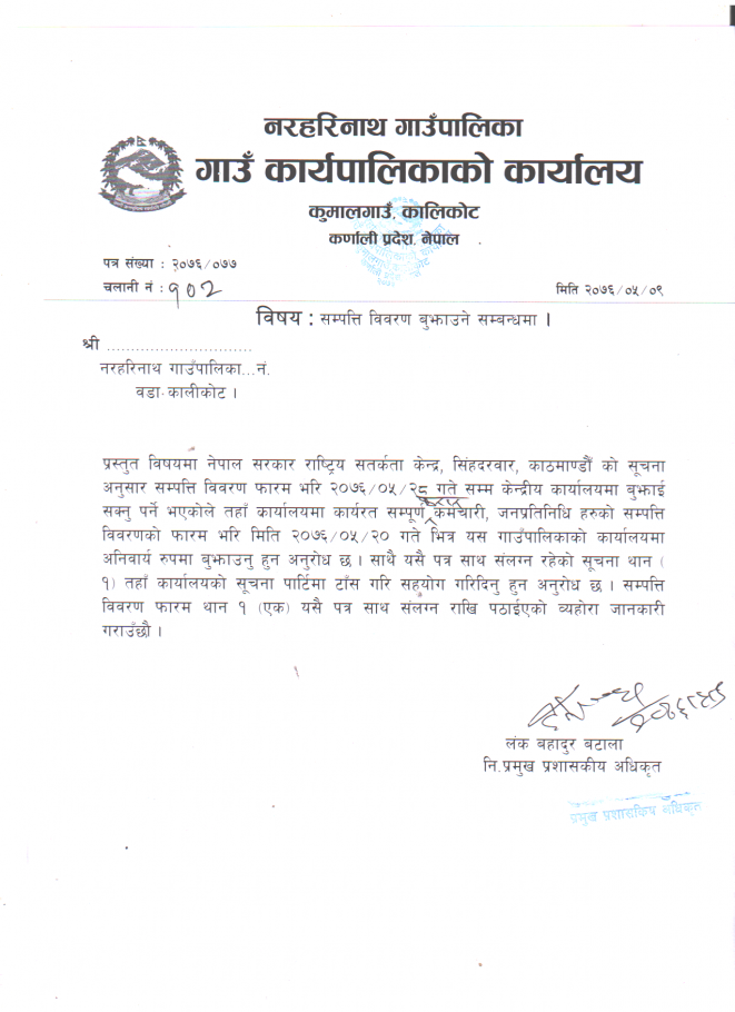 आ.व. २०७५।०७६ को सम्पति विवरण यस नरहरिनाथ गाउँपालिकाका सम्पुर्ण वडा कार्यालयमा कार्यरत कर्मचारीहरु तथा पदाधिकारीहरुले मिति २०७६।०५।२० गते भित्र यस गाउँपालिकाको कार्यालयमा बुझाउन हुन अनुरोध गरिन्छ ।