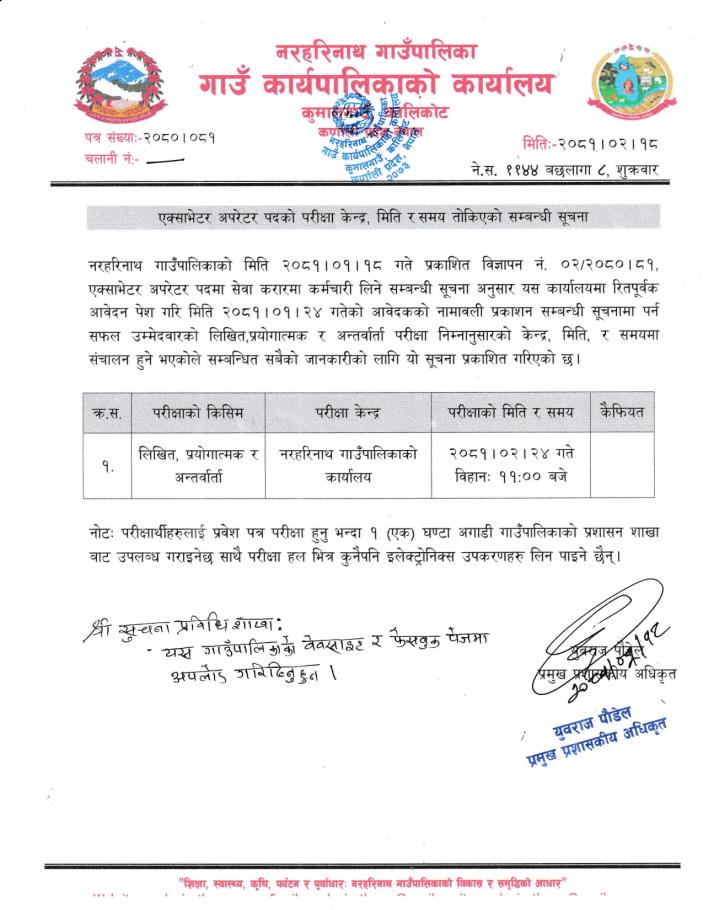 » एक्साभेटर अपरेटर पदको परीक्षा केन्द्र, मिति र समय तोकिएको सम्बन्धी सूचना .