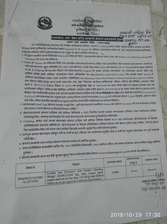 एक्साभेटर तथा ब्रेकर खरिद सम्बन्धी बोलपत्र अाह्वानको सूचना ।
