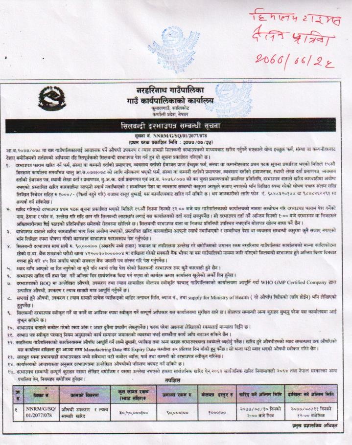 » औषधि उपकरण र ल्याव सामाग्री खरिदको सिलबन्दी दरभाउपत्र सम्बन्धि सूचना ।