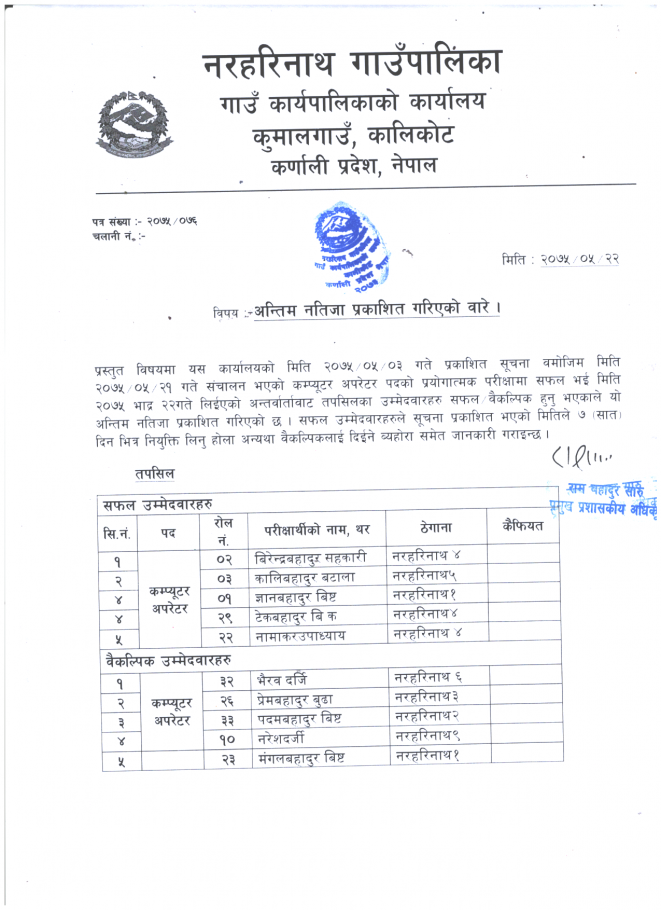 मिति २०७५।०५।२१ गते भएको कम्प्यूटर अपरेट परिक्षाको अन्तिम नतिजा प्रकाशन ।