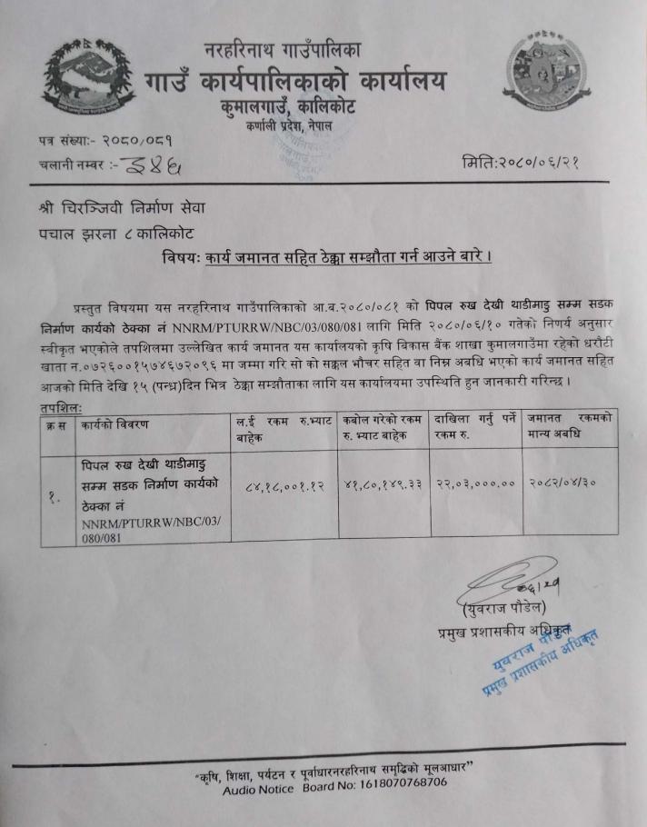कार्य जमानत सहित ठेक्का सम्झौता गर्न आउने बारे सूचना ।