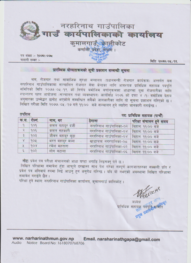 नरहरिनाथ गाउँपालिकाको रोजगार सेवा केन्द्रको प्राविधिक सहायकको प्रारम्भिक योग्यताक्रमको सूचि प्रकाशन सम्बन्धि सूचना ।