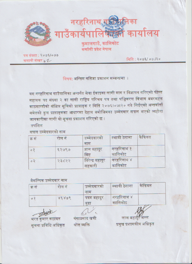 फिल्ड सहायकको अन्तिम नतिजा प्रकाशन गरिएको सम्बन्धमाा ।
