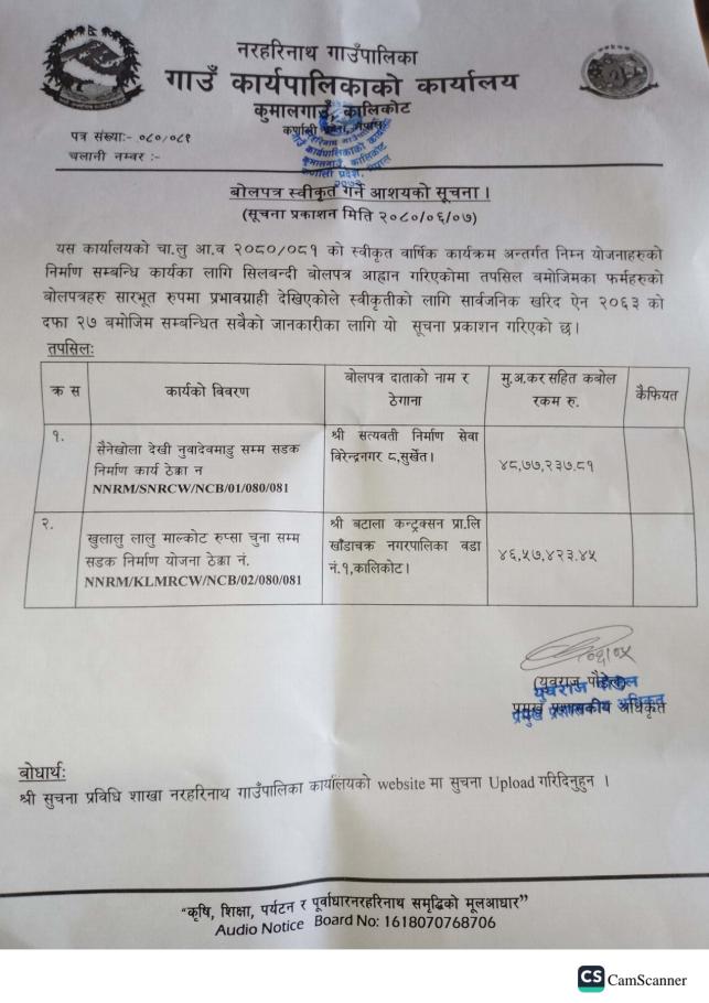 » बोलपत्र स्वीकृत गर्ने आशयको सूचना ।