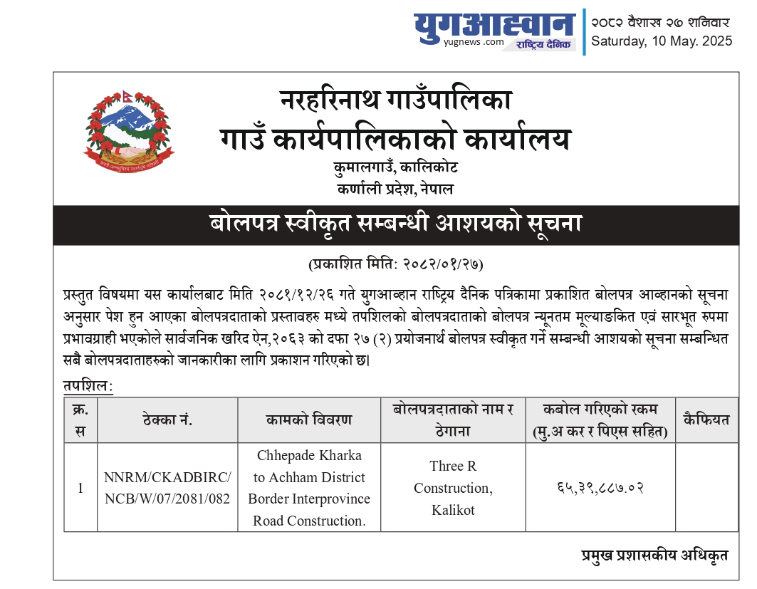 बोलपत्र स्वीकृत सम्बन्धी आशयको सूचना ।