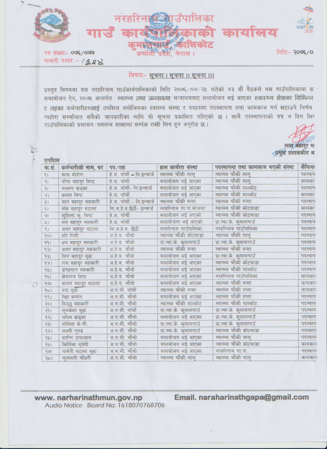 स्वास्थ्य तथा जनसंख्या मन्त्रालयबाट समायोजन भई आएका स्वास्थ्य सेवाका विभिन्न तहका कर्मचारीहरुको पदस्थापना गरिएको छ ।