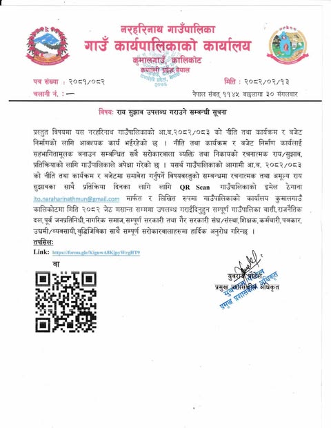 राय सुझाव उपलब्ध गराउने सम्बन्धी सूचना ।