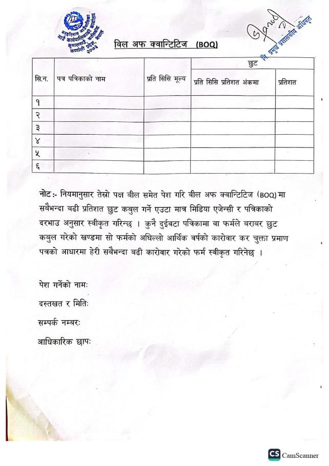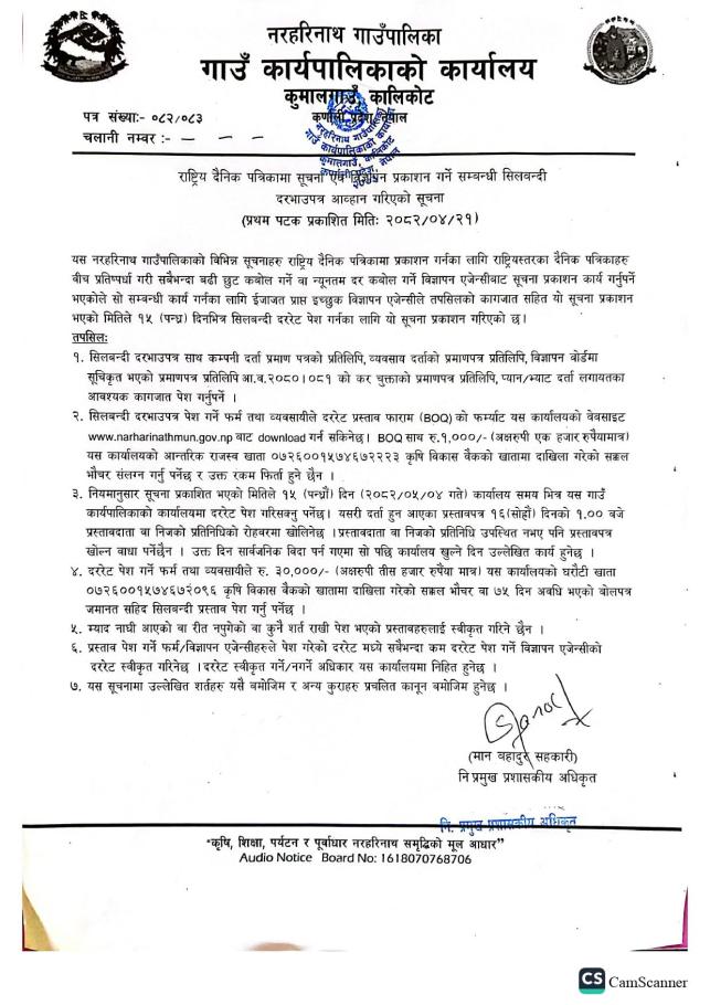 राष्ट्रिय दैनिक पत्रिकामा सूचना एवं विज्ञापन प्रकाशन सम्बन्धी सिलवन्दी दरभाउपत्र आव्हान गरिएको सूचना ।