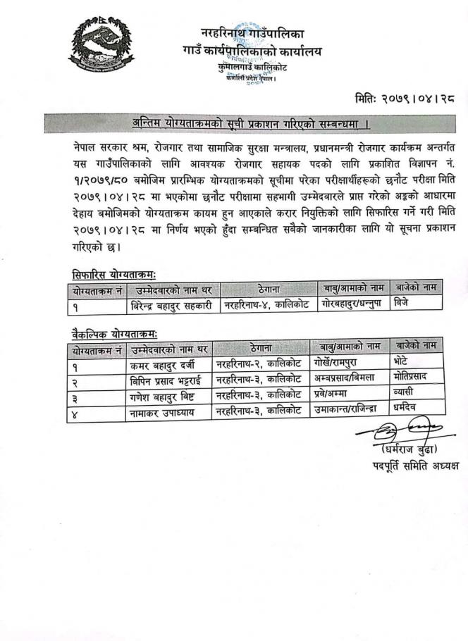 रोजगार सहायकको अन्तिम योग्यताक्रमको सूची प्रकाशन गरिएको सम्बन्धमा ।