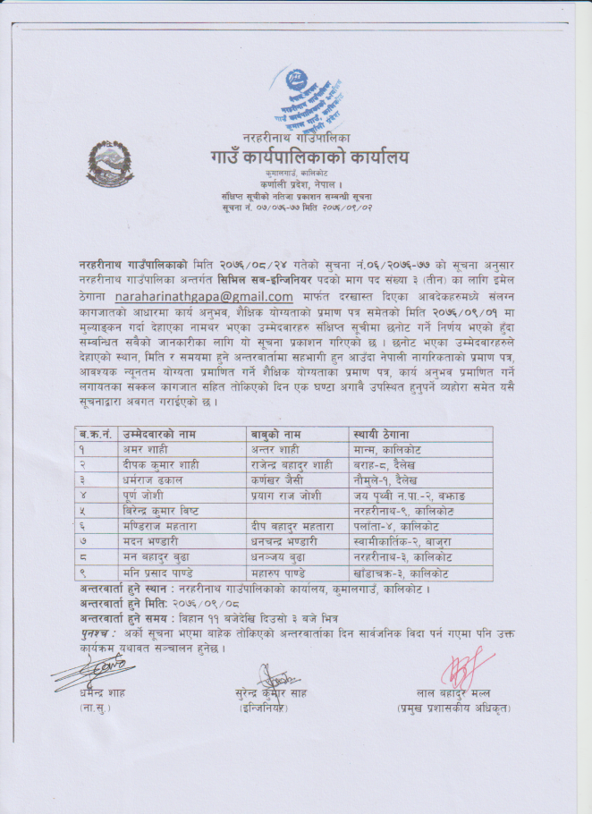 संक्षिप्त सूचीको नतिजा प्रकाशन सम्बन्धी सूचना ।