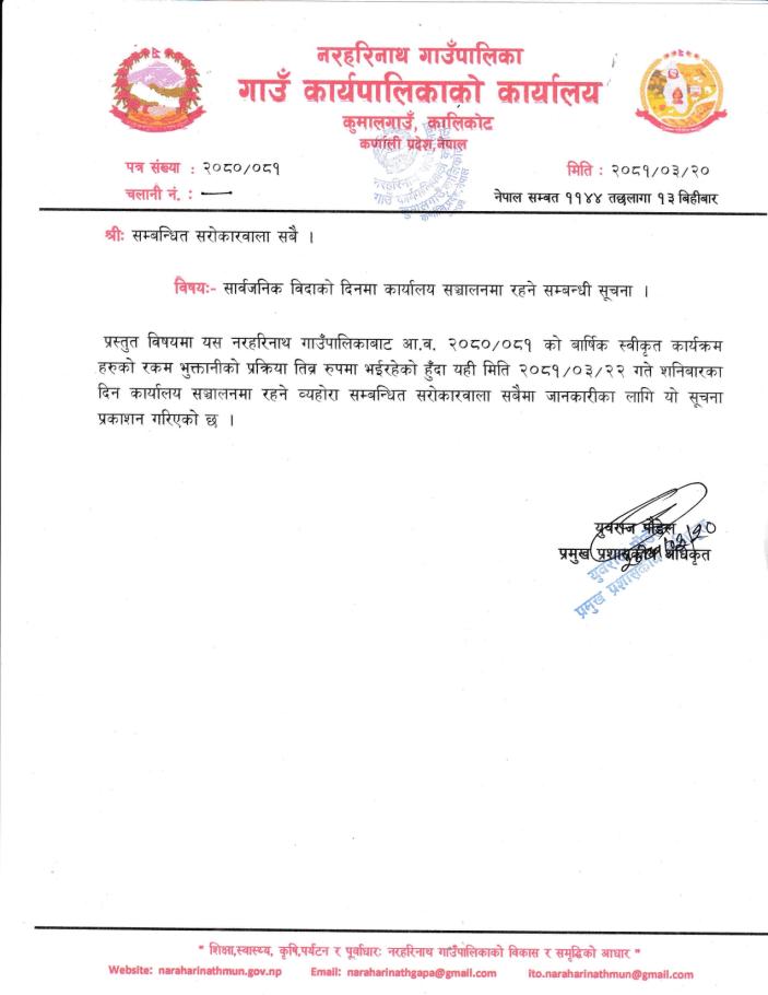 » सार्वजनिक विदाको दिनमा कार्यालय सञ्चालनमा रहने सम्बन्धी सूचना ।