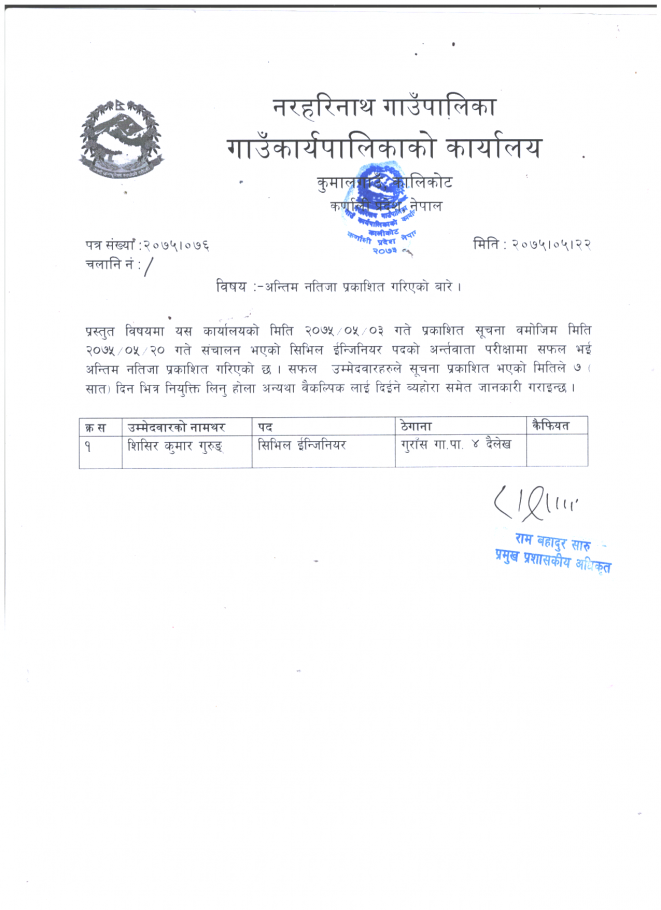 मिति २०७५।०५।२० गते भएको सिभिल ईन्जिनीयरको अन्तर्वार्ताको अन्तिम नतिजा प्रकाशन ।