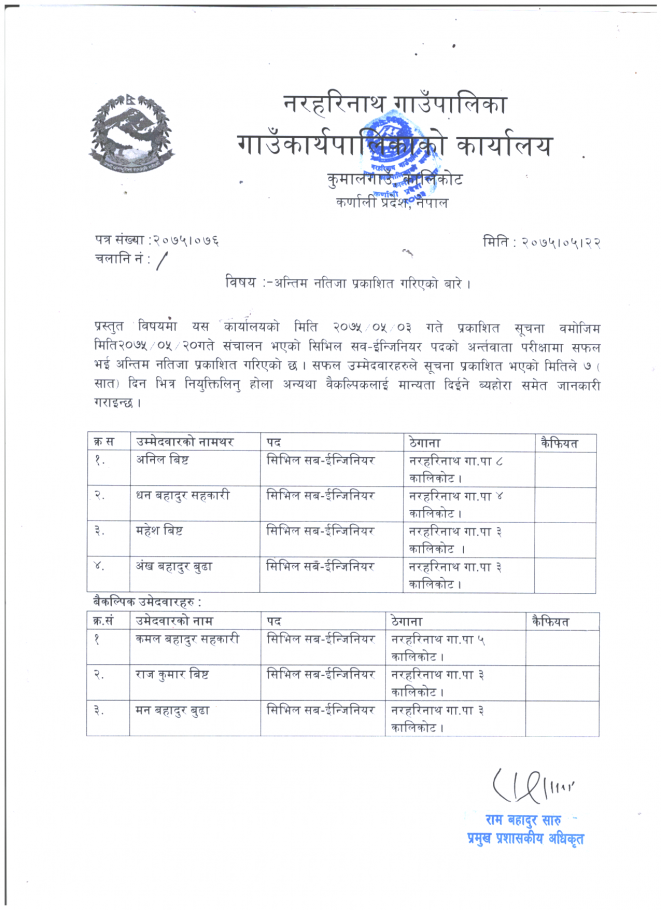 सिभिल सब-ईन्जिनीयरको मिति २०७५।०५।२० भएको अन्तर्बार्ताको अन्तिम नतिजा प्रकाशन ।