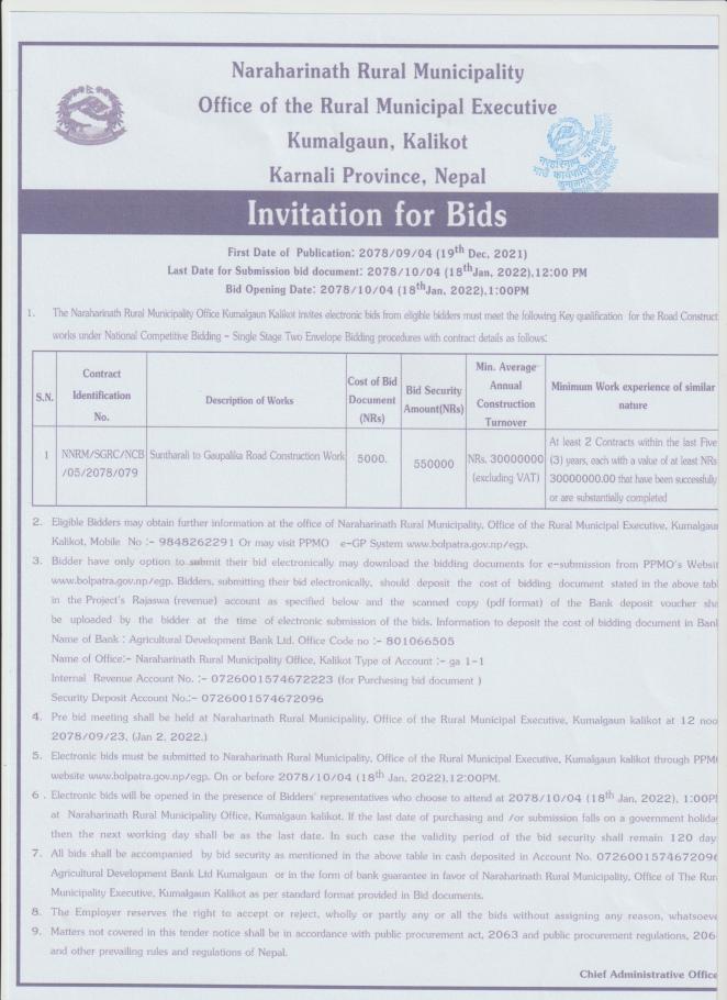 Invitation For Bids Suntharali to Gaupalika Road Construction Work